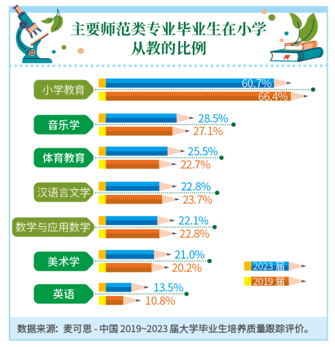 设置在师范院校的师范类专业毕业生是小学教师的重要师资来源。从师范类专业毕业生在小学从教情况来看,小学教育专业毕业生在小学从教的比例明显高于其他专业,2023届为60.7%。超六成小学教育专业毕业生在小学从教,是小学从教人员的最重要来源。